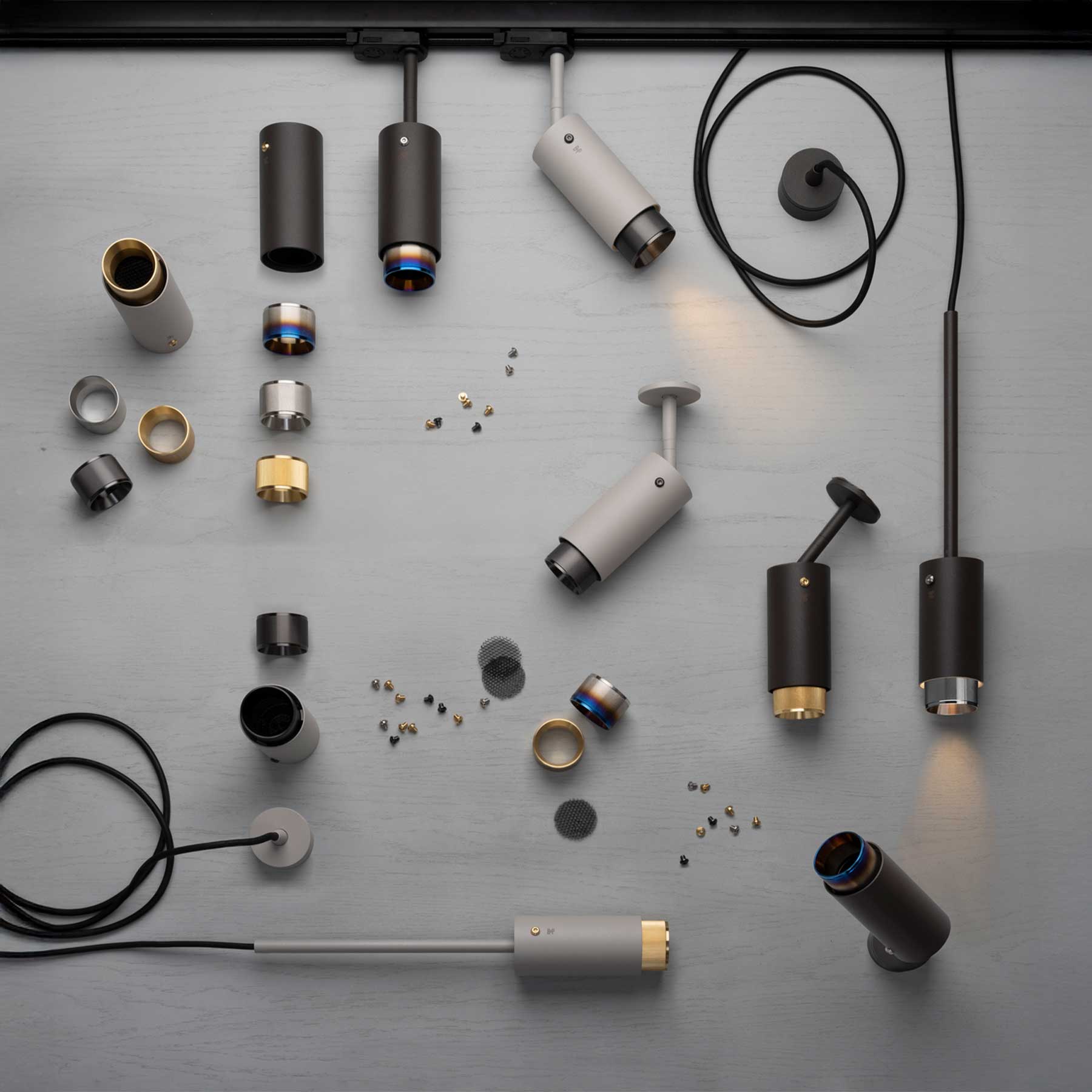 Exhaust Cross reflektor na kolejnicový systém je vyroben z kovu s povrchovou úpravou z grafitu nebo kamene a doplněn o detaily z nerezové oceli v čtyřech povrchových úpravách, včetně křížově rýhované clony a soustružených šroubů s mincovým provedením, které mají lesklý lakovaný povrch. Clona zachycuje světlo a vytváří jemný kovový lesk, zatímco honeycomb filtr zajišťuje přesné, neoslňující a směrové osvětlení. Reflektor je plně nastavitelný, dodává se s univerzálním adaptérem pro 3-okruhové kolejnicové systémy v černé barvě a je kompatibilní s žárovkami GU10.