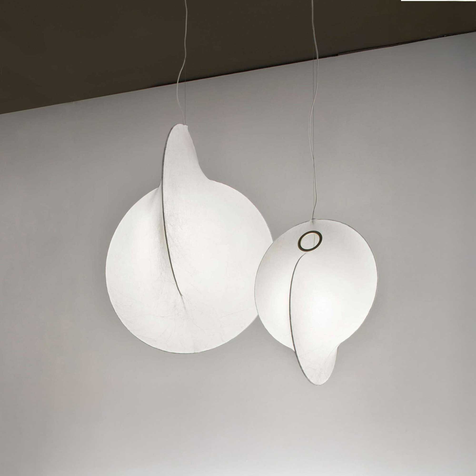 Závěsné svítidlo Overlap od italské značky Flos, navržené Michaelem Anastassiadese, je unikátním příkladem spojení inovativních technologií a jemné estetiky. Vnitřní konstrukce svítidla je vyrobena z oceli s bílým práškovým lakem a je potažena speciální pryskyřičnou vrstvou Cocoon, která vytváří měkké, rozptýlené světlo. Povrch je následně chráněn transparentním nástřikem. Výrazným designovým prvkem je také kovový kroužek ve zlatě galvanizované povrchové úpravě, jenž opticky přerušuje objem svítidla. Stropní rozeta je vyrobena z leštěné slitiny Zamak, rovněž se zlatou galvanickou úpravou. Svítidlo je k dispozici ve dvou velikostech a připomíná kokon, jehož jemná struktura navozuje atmosféru klidu a harmonie.