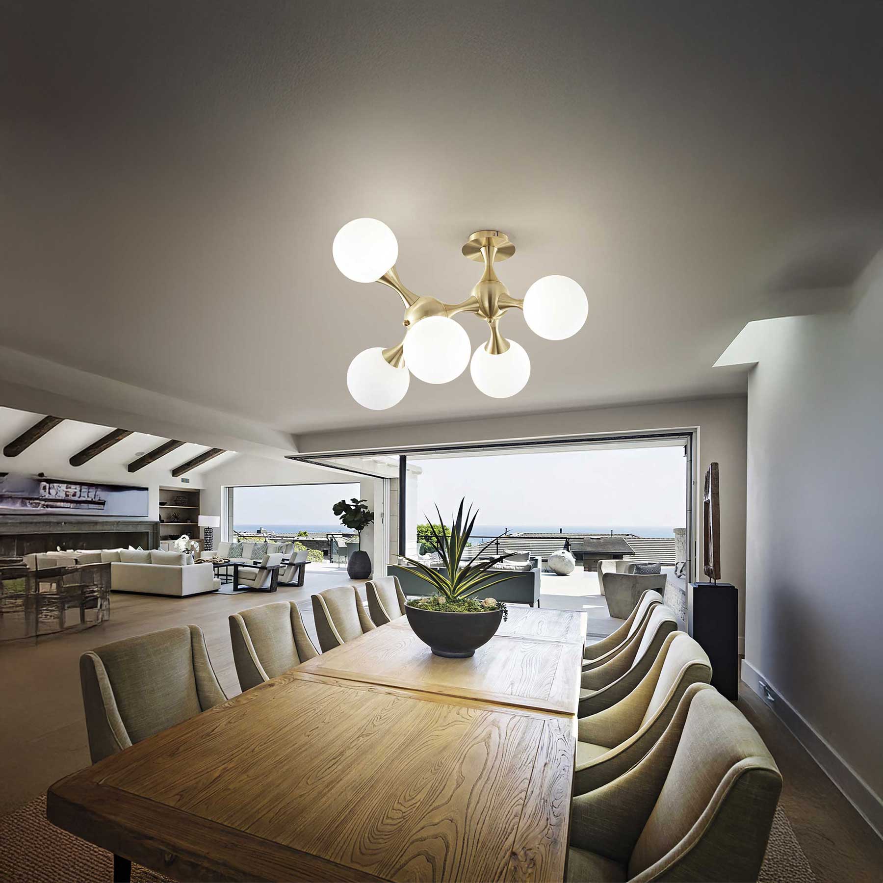 Přisazené stropní svítidlo Nodi od italské značky Ideal Lux je elegantní designový prvek vhodný pro moderní interiéry. Kovová konstrukce v provedení chrom nebo saténová mosaz nese pět skleněných difuzorů ve tvaru koulí, které jsou vyrobeny z bílého kyselinou leptaného ručně foukaného skla, případně v transparentní nebo chromované variantě. Svítidlo je osazeno paticemi E14, což umožňuje použití různých typů žárovek dle potřeby. Organicky tvarovaná struktura svítidla připomíná molekulu a zaujme jak po funkční, tak po estetické stránce. Nodi se skvěle hodí do obývacích pokojů, jídelen nebo vstupních hal, kde plní roli dekorativního a zároveň praktického světelného objektu.