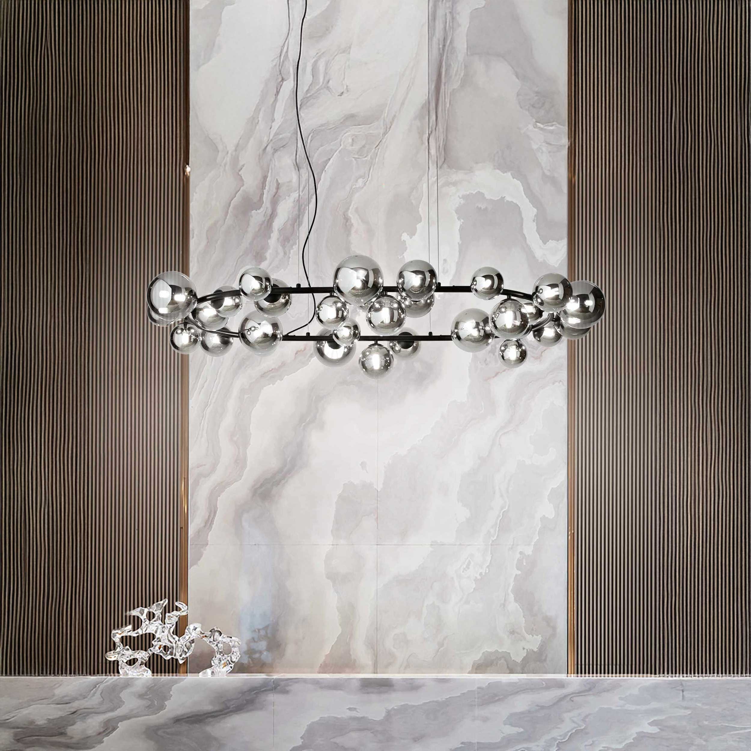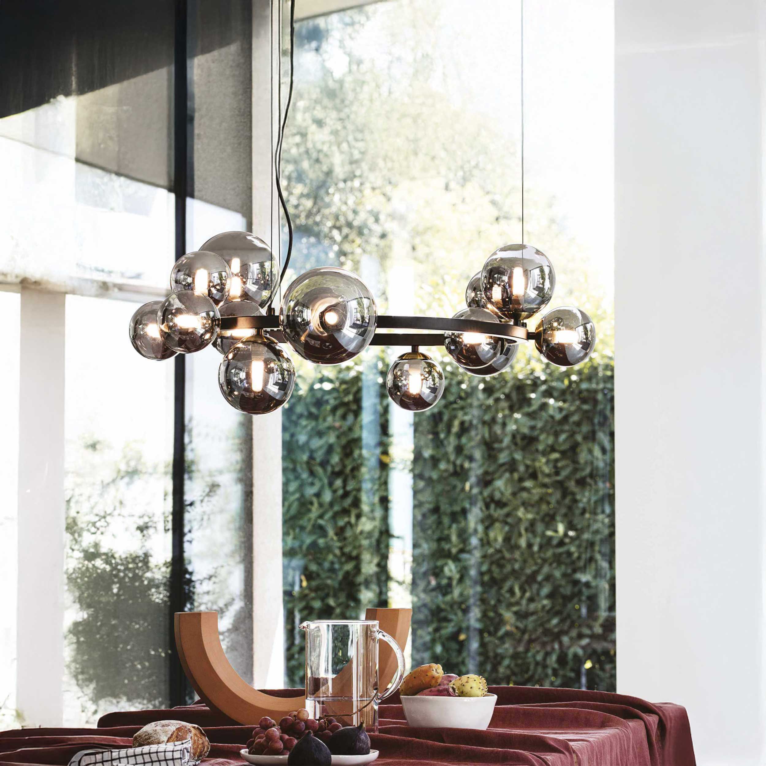 Závěsné svítidlo Perlage od renomovaného italského výrobce Ideal Lux představuje elegantní spojení moderního designu a precizního zpracování. Kruhová kovová konstrukce doplněná difuzory z ručně foukaného skla zajišťuje jemné a rovnoměrné rozptýlení světla a zároveň dodává svítidlu výrazný dekorativní charakter.